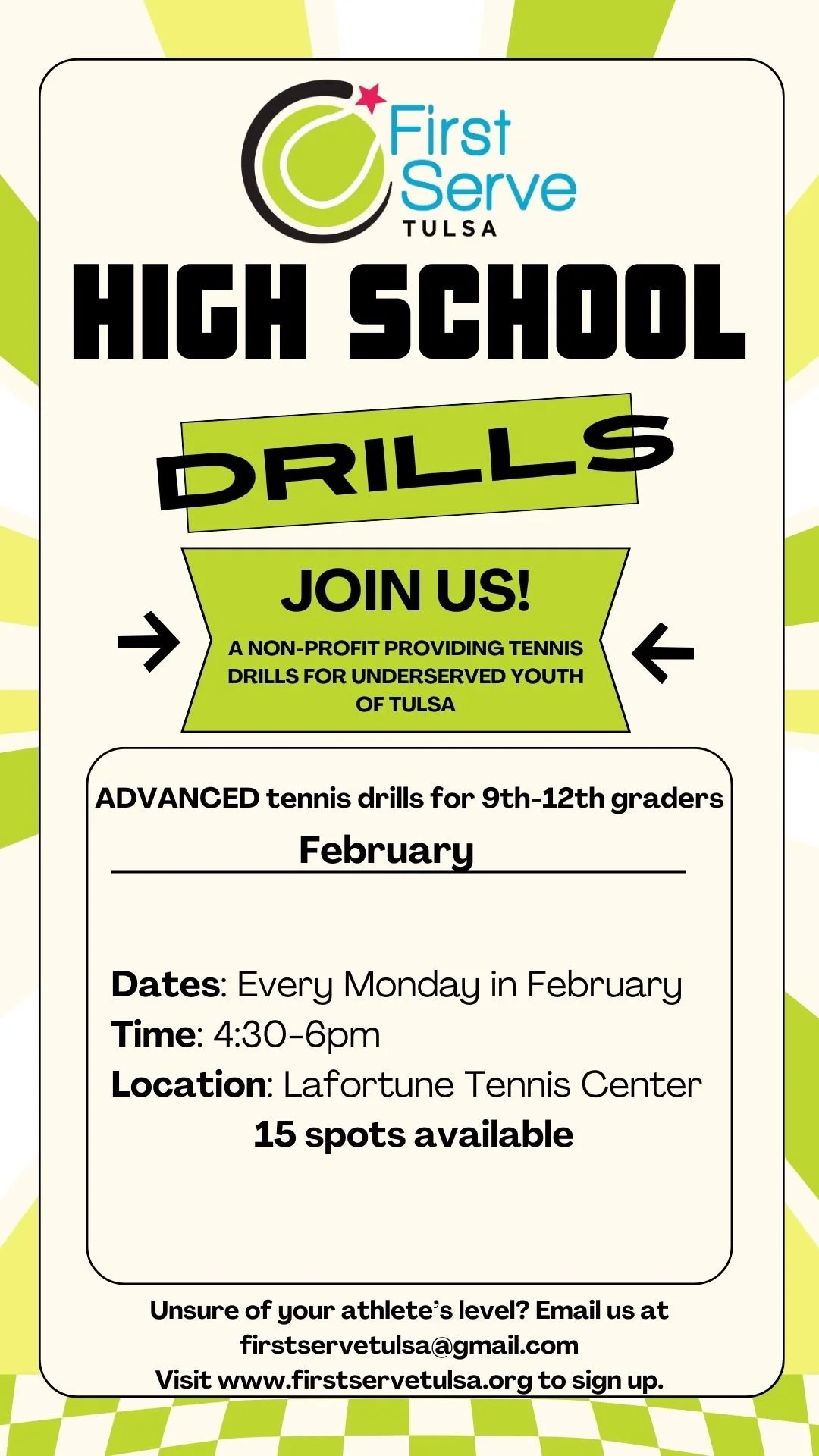 If you’re unsure whether you qualify or have questions about your athlete’s level, please email us at firstservetulsa@gmail.com.